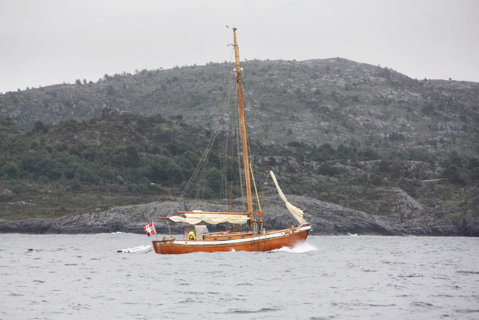 | Ligesom vi anløber Sarvåg havn efter 25 mils sejlads, forlader den sidste danske båd Sarvåg. Det er "lille Liv" fra Århus. De har haft rorproblemer, som nu er udbedret. Wiren fra rorpind til roret, der sidder længere fremme end pinden, var sprængt. |